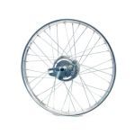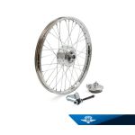 Komplett 19 tums bakhjul, med Leleu 100mm nav. Crescent 1210, men kan även passa andra Monark & Crescent. Då behövs modifiering av bromsfäste. Dessa hjul är ekrade i 2-kors, ej 3-kors.