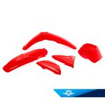 Satsen är ljusröd och inte mörkröd. Komplett kåp och skärmsats innehållande samtliga färgade plastdetaljer för Yamaha DT50MX/DT80MX. Hög kvalitet med mycket bra passform. Färg: Yamaha kod: E1, Chappy Red.