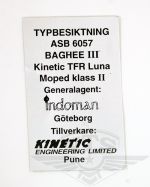 Typskylt Baghee Kinetic. Chassi