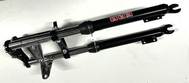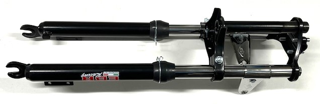 Framgaffel till Puch Maxis moped modeller. Denna variant är i Svart utförande. Avstånd från hjulaxel till styrstam är ca 580mm. Breddmåttet mellan gaffelbenen är ca 105mm. Klacken för att fixera bromstrumman sitter på vänster gaffelben. Dessa modeller monteras på många olika mopedmodeller efter diverse modifieringar.